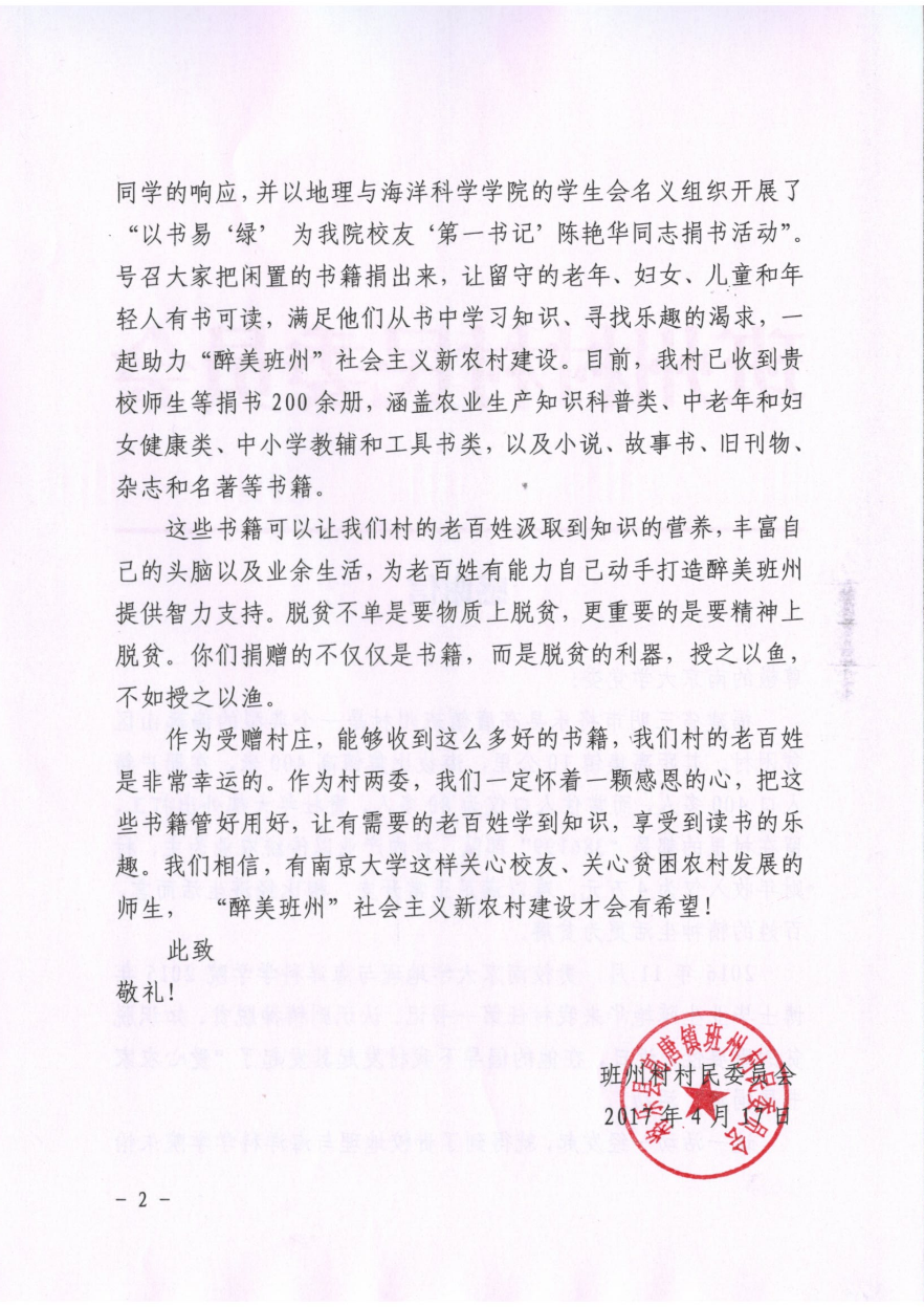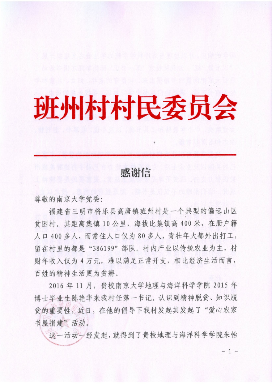 福建省三明市将乐县高唐镇班州村是一个典型的偏远山区贫困村。其距离集镇10公里,海拔比集镇高400米,在册户籍人口400多人,而常住人口仅为80多人,青壮年大都外出打工,留在村里的都是“386199”部队。村内产业以传统农业为主,村财政年收入仅为4万元,难以满足正常开支,相比经济生活而言,百姓的精神生活更加贫瘠。现任班州村任“第一书记”的有爱爱 校友陈艳华,在认识到村民精神脱贫的重要性后,倡导开展“爱心农家书屋捐建”活动,有爱爱 黄贤金教授知晓了这一信息,立即倡议全院师生积极响应,大力支持校友陈艳华同志的工作、支持班州村的社会主义新农村建设。