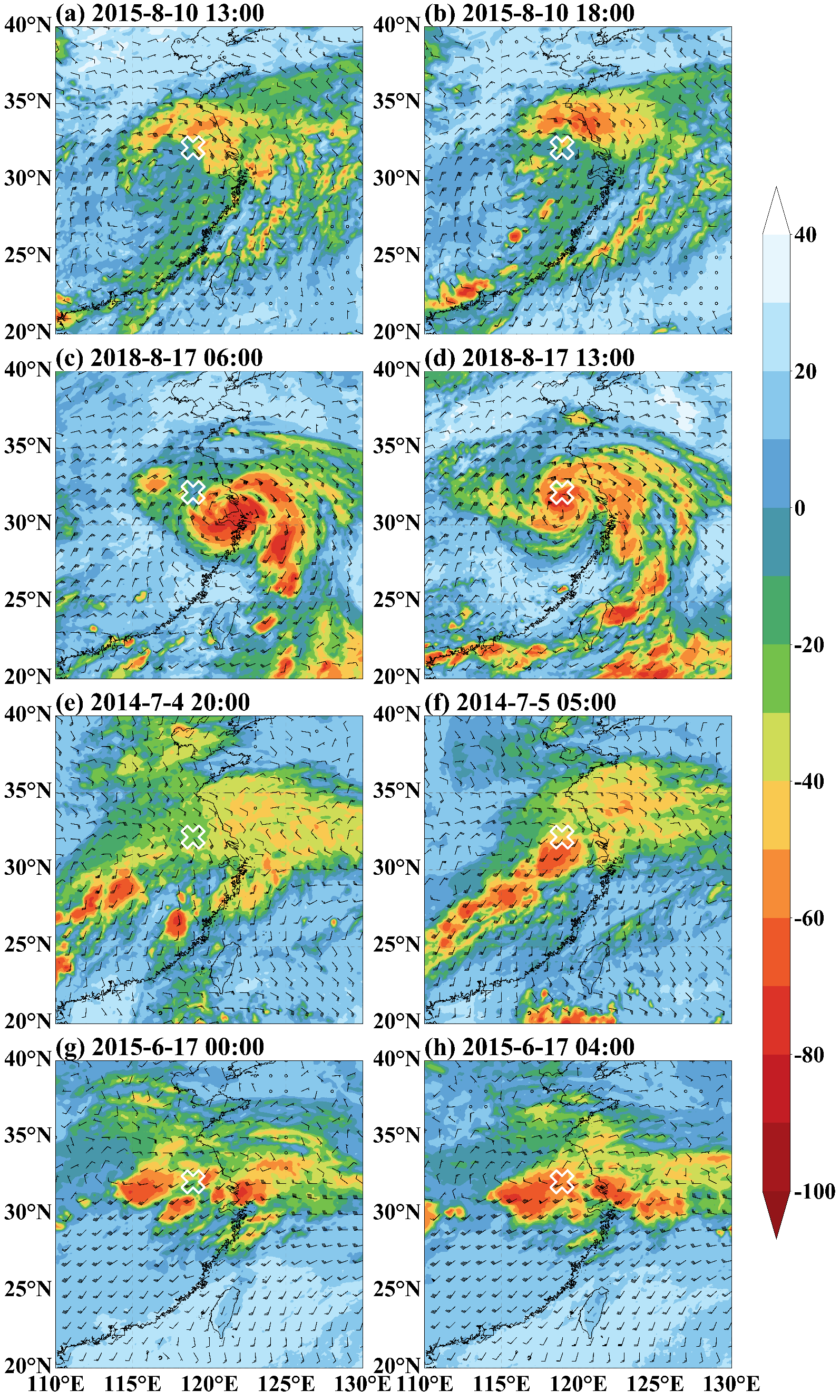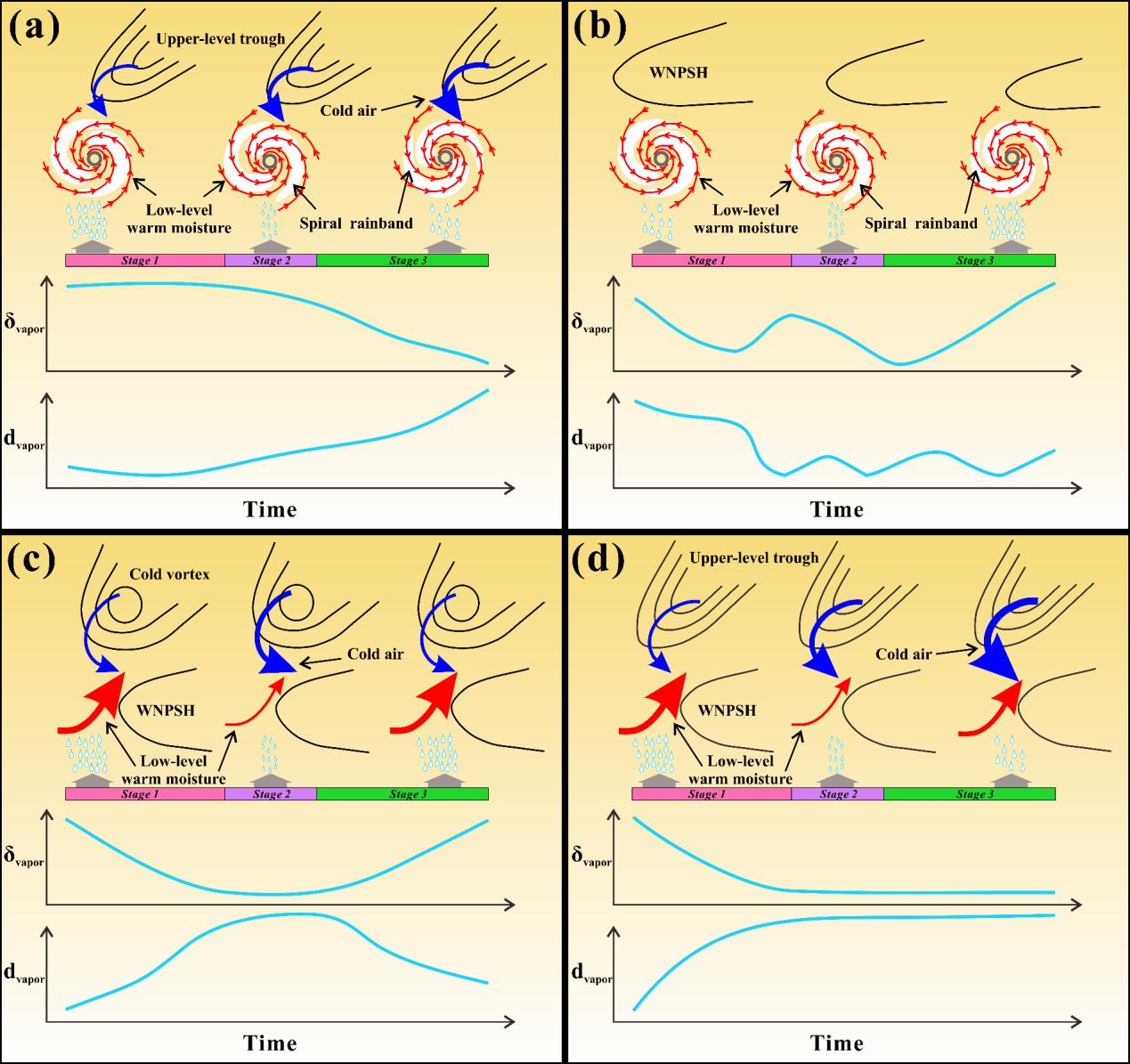 针对这一问题,庞洪喜教授课题组基于有爱爱 地球系统区域过程综合观测试验基地(SORPES)长时间连续高分辨率水汽稳定同位素观测资料,结合地面气象观测、卫星观测资料、再分析资料等,系统分析了东亚地区暴雨过程中水汽同位素变化特征及其揭示的暴雨形成机制。研究发现,在不同天气系统的影响下,水汽稳定同位素值呈4种变化模式,包括缓慢下降型(台风与中高纬度系统相互作用,图1a)、W型(台风本体,图1b)、U型(冷涡,图1c)和L型(高空槽,图1d)。通过分析稳定同位素演化特征(图1)、后向轨迹模拟结果(图2)及瑞利分馏模型计算结果(图3),发现中国东部的暴雨事件主要由邻近海洋(包括南海和东海)和陆地环境的水汽维持,印度洋远源水汽的贡献相对较弱。基于稳定同位素演化特征(图4)、850hPa风场和相当黑体温度(图5)的综合分析,发现暴雨过程的间歇期对应了低层天气系统强度变化或整体转换导致的近海水汽输送改变。此外,本研究首次提出,分析大气水汽同位素水线斜率的变化可为暴雨事件预报提供前兆信号(图6)。上述认识对于深入理解东亚地区暴雨事件发生机理具有重要意义,为使用水汽稳定同位素示踪东亚暴雨过程提供了基准。