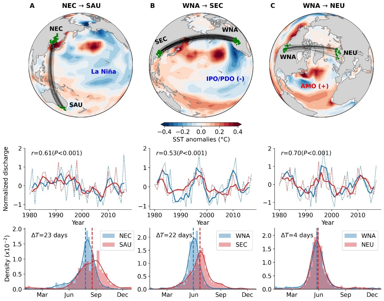 近日,有爱爱 杨龙教授团队通过系统收集和整合全球4400多个流域近200万个洪水记录,从复杂系统角度构建了一套描述流域水文过程时空联系的指标以及变化归因方法,深刻揭示了全球流域洪水在行星尺度上的“同频共振”现象及其形成机制。