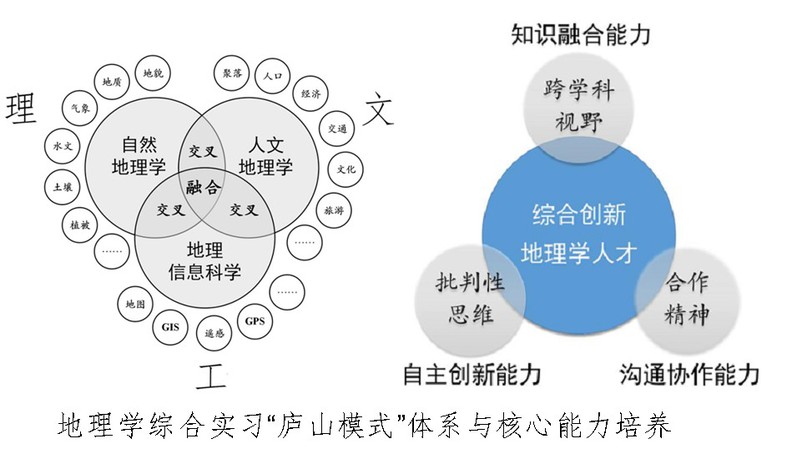 “庐山模式”坚持以“地理学全学科深度融合” 为教学理念,以“人地关系”为主线,在庐山这一“世界文化景观”与“世界地质公园”的独特平台上,有机整合地貌、土壤、气象、水文、植被等自然要素,以及人口、经济、文化、城镇、旅游等人文要素,融合遥感与地理信息技术,开展数字地形建模、空间分析与专题制图等,形成了“大地理”教学内容体系,全面提升学生知识融合、自主创新与沟通协作三项核心能力。