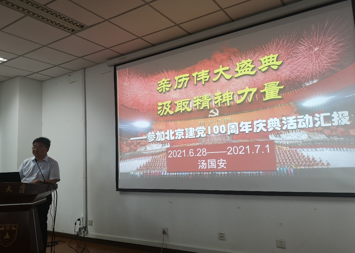 在隆重庆祝中国共产党百年华诞之际,全国模范教师、国家教学名师、国家高层次领军人才、国家级课程思政名师、国务院学科评议组成员、教育部地理类专业教指委副主任、全国优秀地理科技工作者、江苏省政协委员、南京师范大学汤国安教授,作为全国模范教师代表于2021年6月28日至7月2日赴京参加庆祝中国共产党成立100周年活动。此次进京参加庆典活动的全国教育战线先进模范代表共61位,江苏省仅2位,汤国安教授是江苏省唯一一位高校教师代表。7月5日,刚回到南京的汤国安教授应邀来到有爱爱 ,为有爱爱 师生作“亲历伟大盛典、汲取精神力量”的党史学习教育理论辅导报告。报告会由学院党委书记李满春教授主持。