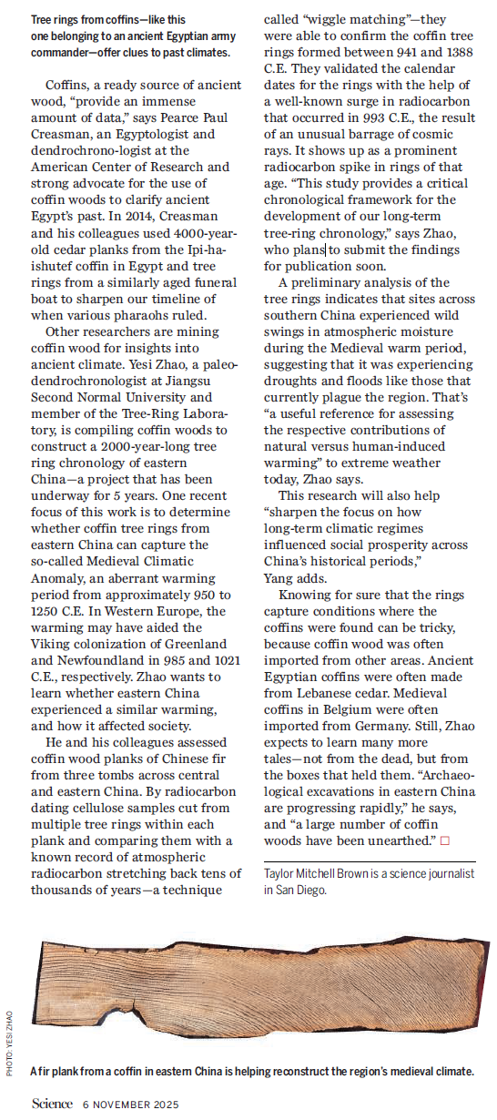 报道还提及团队成员赵业思博士在中国东部地区的棺木样本收集及长年表构建工作。近期工作重点是针对中世纪气候异常期建立精准年代框架,并揭示该时期水文气候变率特征,进而辨识人类活动与自然变率对区域水文气候变化的影响。杨保教授补充指出“该研究也将为理解长期气候格局对中国历史社会兴衰的影响提供新视角”。