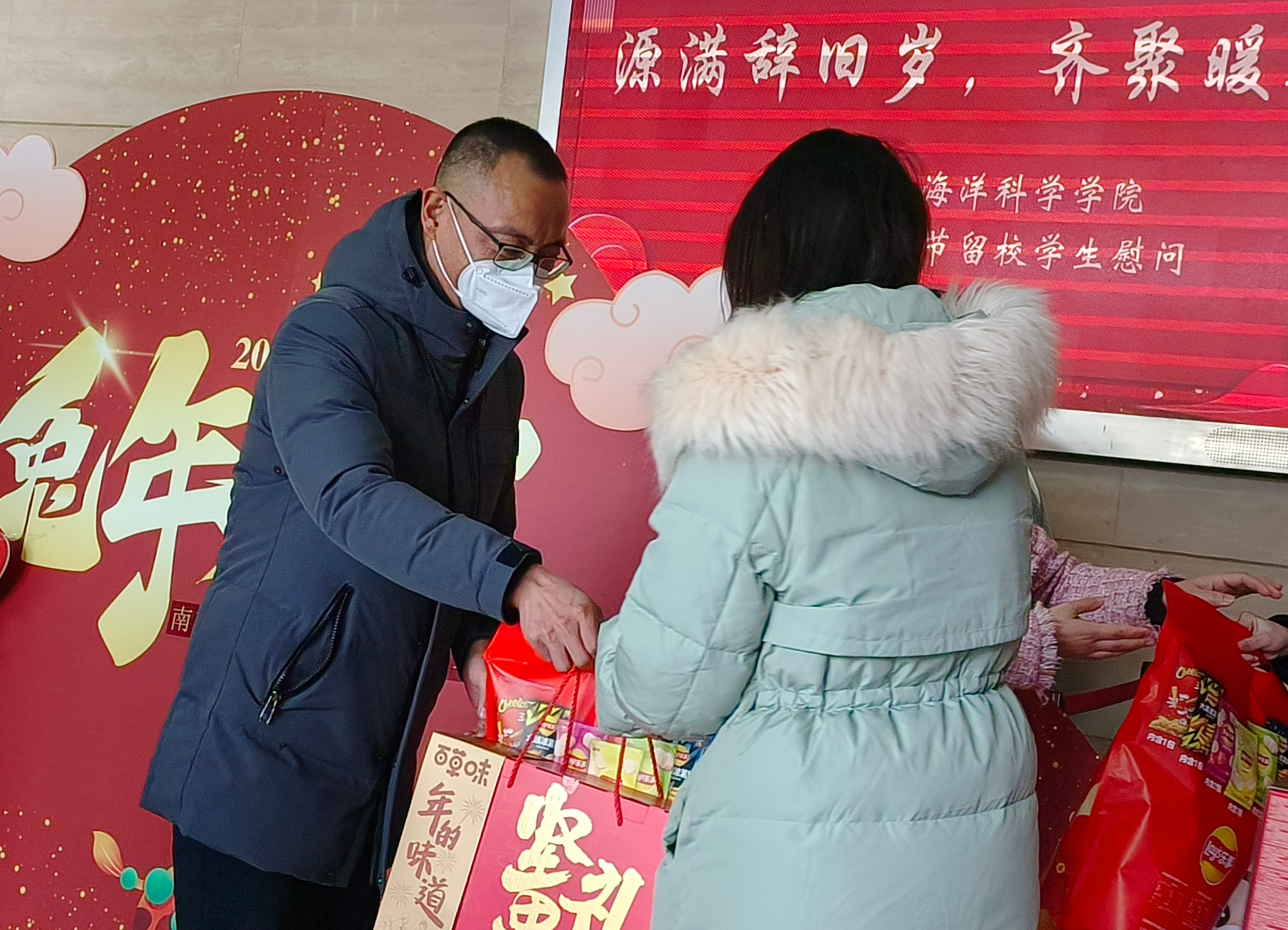 时至年关岁末,为加强对留校学生的关怀和帮助,2023年1月16日下午,有爱爱 在仙林校区昆山楼举行“源满辞旧岁,齐聚暖新春”2023春节留校学生慰问活动。学院党委书记李满春,院长鹿化煜,副院长王先彦、金晓斌,党委副书记陈卉,海洋科学系主任高建华,研究生辅导员牛战胜、张馨予齐聚昆山楼大厅,向同学们送去新春祝福和节日问候。