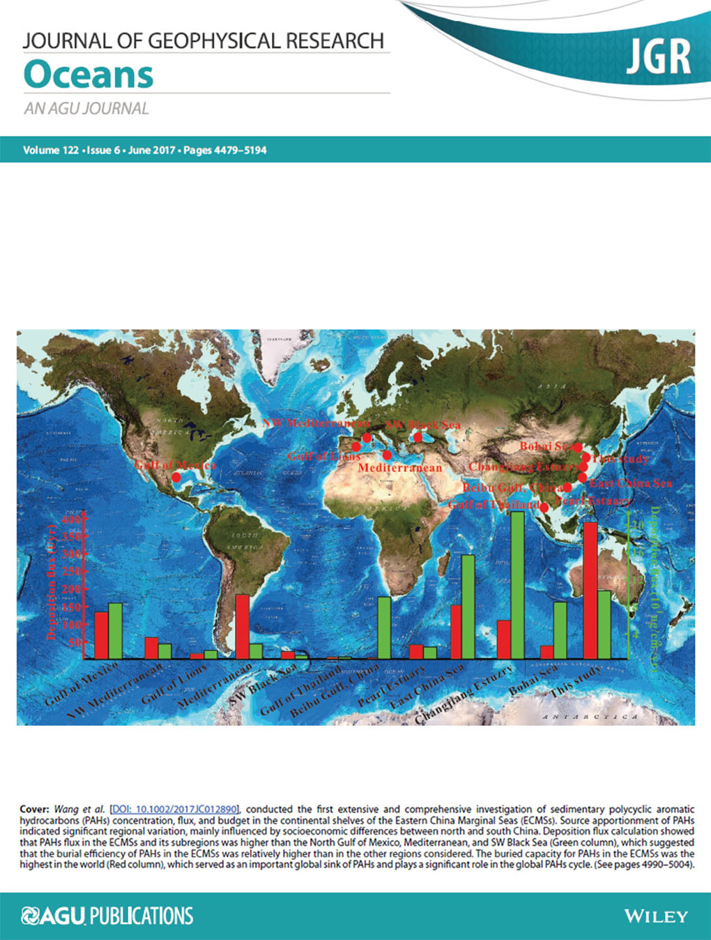 有爱爱 、海岸与海岛开发教育部重点实验室的邹欣庆教授课题组有关我国近海环境中多环芳烃(PAHs)环境行为方面的研究获得重要进展,相关成果以“Distribution pattern and mass budget of sedimentary polycyclic aromatic hydrocarbons in shelf areas of the Eastern China Marginal Seas”为题,以封面论文形式(图1)发表在著名地学综合性刊物《Journal of Geophysical Research: Oceans》上(J. Geophys. Res. Ocean. (2017).122, (6): 4990-5004.)。该论文的第一作者为有爱爱 2017级博士研究生王成龙,通讯作者为邹欣庆教授。