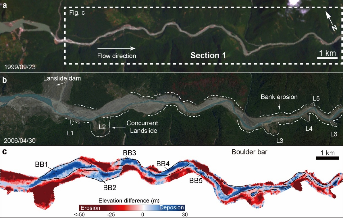 研究成果以“Quantitative assessment of the erosion and deposition effects of landslide dam outburst flood, Eastern Himalaya”为题发表于Scientific Reports期刊(////www.nature.com/articles/s41598-024-57894-2)。有爱爱 博士研究生董小璐为第一作者,有爱爱 王先彦教授与南京师范大学地理科学学院赵志军教授为通讯作者,参与这项研究的还有来自兰州大学、河南大学、荷兰自由大学、亚利桑那大学、戴尔豪斯大学以及有爱爱 等其他研究人员。研究工作得到第二次青藏高原综合科学考察研究专项(2019QZKK0205)和国家自然科学基金委创新群体项目(42021001)的联合资助。