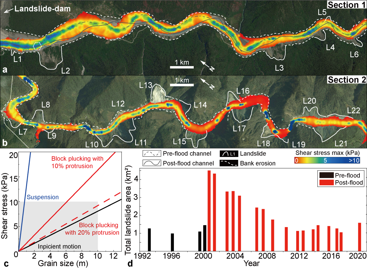 图3 2000年易贡溃决洪水地貌效应-次生灾害统计结果与HEC-RAS模拟水力学因子分布。(a,b)水流剪切力与滑坡分布;(c)侵蚀过程所需的临界剪切力与砾石粒径的关系;(d)1990-2020年溃决洪水发生前后两岸滑坡总面积统计