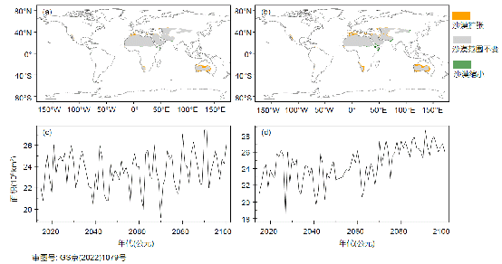 图4. 到2100年全球沙漠范围和面积变化. (a), (b)分别为ssp245和ssp585情景下2071-2100年相比于2015-2044年的沙漠范围变化.(c), (d)分别为ssp245和ssp585情景下2015-2100年沙漠面积变化.