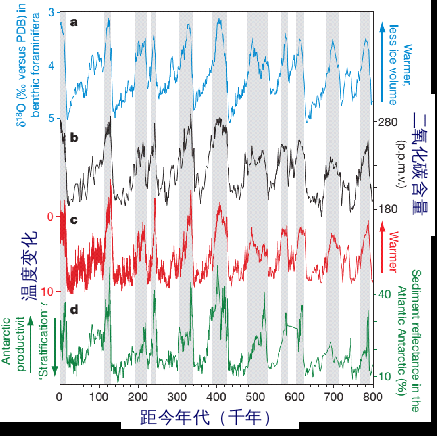 图3 过去80万年地球大气温室气体含量与南极温度变化