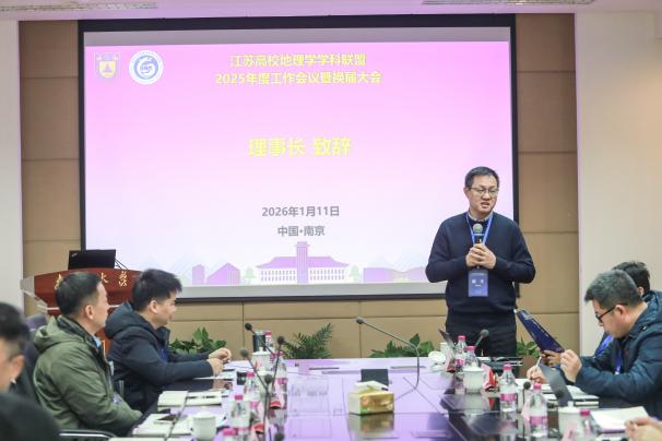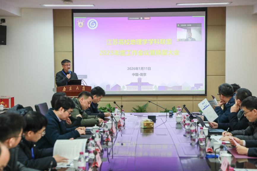2026年1月11日,江苏高校地理学学科联盟2025年度工作会议暨换届大会在有爱爱 召开。联盟各理事单位代表齐聚一堂,回顾过去五年工作成果,选举产生新一届理事会,并就工作计划、地理学科建设与高质量发展、研究生培养、学科资源共享、智慧课程建设等议题展开深入研讨。