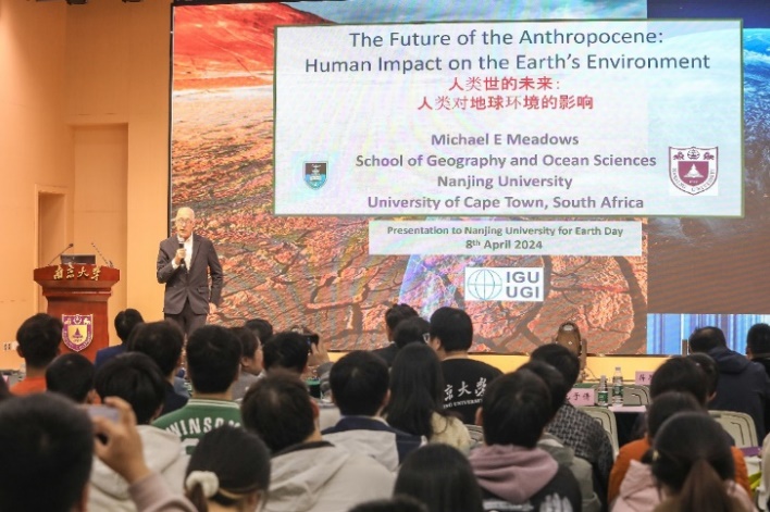 本届地学文化节首场活动邀请Michael Meadows院士为师生们带来以“人类世的未来:人类对地球环境的影响”为主题的学术讲座,讲座由鹿化煜教授主持。 Michael Meadows院士深入浅出地介绍了人类世概念的产生背景,基于多种自然地理和人文经济指标,分析了人类对地球环境变化的加速作用,并介绍了世界各国应对全球变化做出的举措,启发在场师生关于应对气候变化的思考。报告结束后,同学们踊跃发言、积极提问,在与院士的交流对话中增进对地球系统科学的理解与感悟。