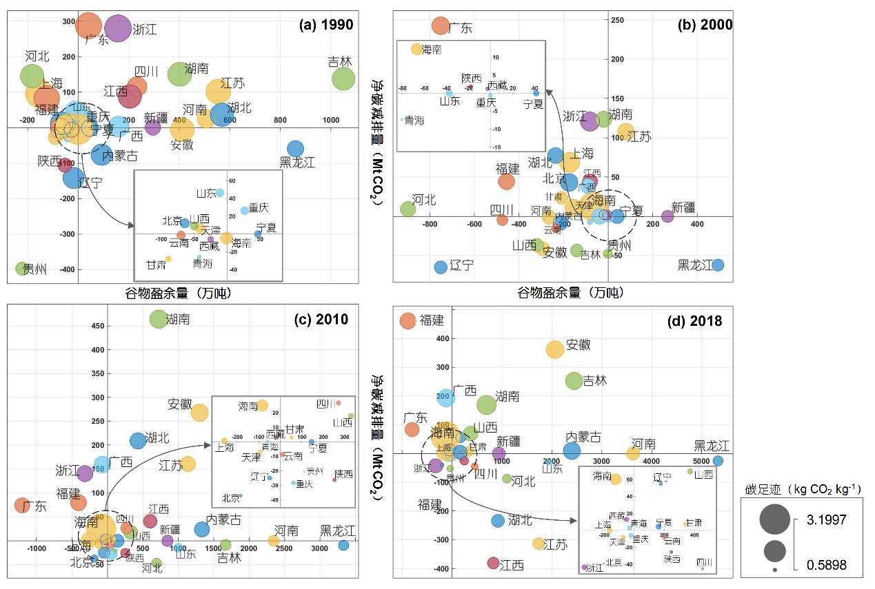 图4 1990-2018年中国31个省级行政区谷物贸易盈余量、净碳排放量和