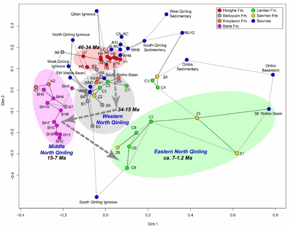 图中距离相近的样品代表其锆石年龄谱相似度大,指示物质来源类似。渭河盆地沉积物源在34 Ma、15 Ma、7 Ma等阶段有显著变化,指示北秦岭不同区域的山体剥露、抬升过程。