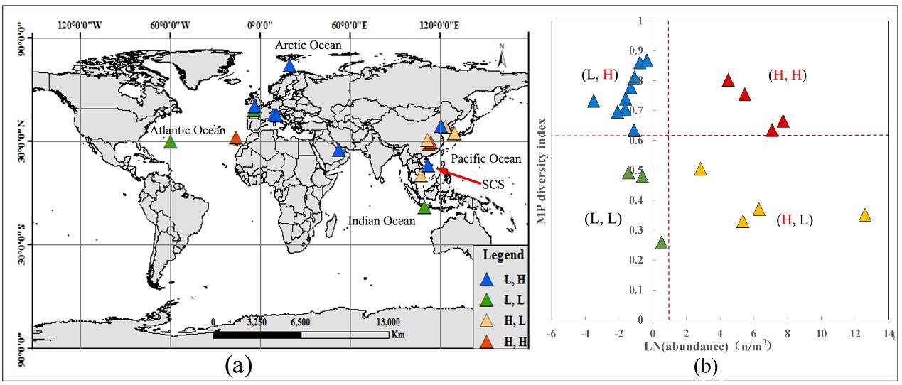 图2. 基于丰度-多样性二维指数的全球表层微塑料分布(a)及分区(b)图。其中,H-高, L-低,图2(b)中红色虚线表示丰度/多样性高低的界限。