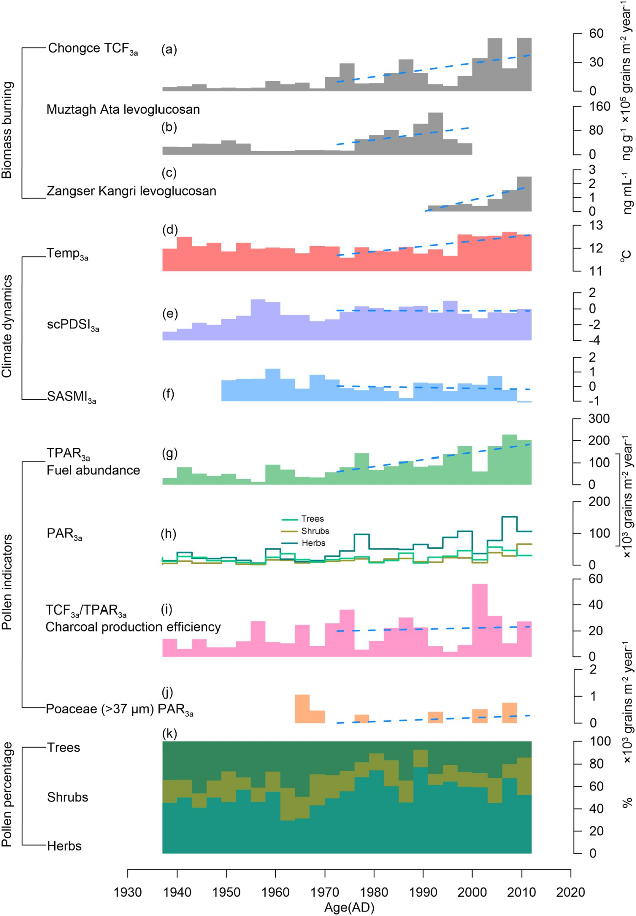 本研究获取了青藏高原西部崇测冰芯上部30.5m的炭屑记录,重建了1935-2012年研究区生物质燃烧排放历史,发现1970年代以后生物质燃烧排放显著增加(图2)。基于HYSPLIT后向轨迹模型识别了炭屑排放源区,并且通过全球火灾排放数据库(GFED)验证了总炭屑通量是生物质燃烧排放的可靠代用指标(图3)。与花粉记录、气候(CRU)、土地利用(HYDE)等数据综合分析,揭示了1970年代以来,生物质燃烧排放由气候—植被自然调控转变为农业燃烧等人为活动主导(图4)。此外,研究表明,生物质燃烧是崇测冰芯黑碳的主要来源,表明人为火灾加剧了青藏高原吸光性气溶胶沉降,从而可能加速冰川消融(图5)。