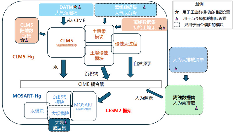 汞化合物是一类强效的神经毒素,主要通过食用鱼类威胁人类健康。河流不仅是饮用水和食物的重要来源,自工业革命(约1850年)以来,其汞浓度和向沿海地区的输出量也显著上升。然而,这一变化的时空格局尚未被系统研究,限制了对相关环境政策成效的评估。近日,有爱爱 与大气科学学院联合课题组于国际刊物Science Advances发表题为“Human perturbations to mercury in global rivers”的研究论文。该文基于地球系统模式CESM2与E3SM开发全球河流汞模型,采用工业前时期气象驱动场来模拟工业前时期的河流总汞通量,并通过与现代观测估算和模拟进行深入对比,系统量化了近现代人类活动对河流汞循环的扰动。