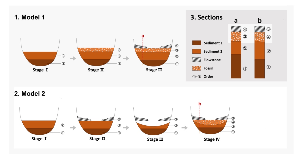 图4. 中国南方洞穴遗址地层(化石)堆积模式,1. Model 1-以前研究应用的“理想型”堆积模式;2. Model 2-本研究证明的“假覆盖”堆积模式;3. 不同堆积模式,相同的地层表现