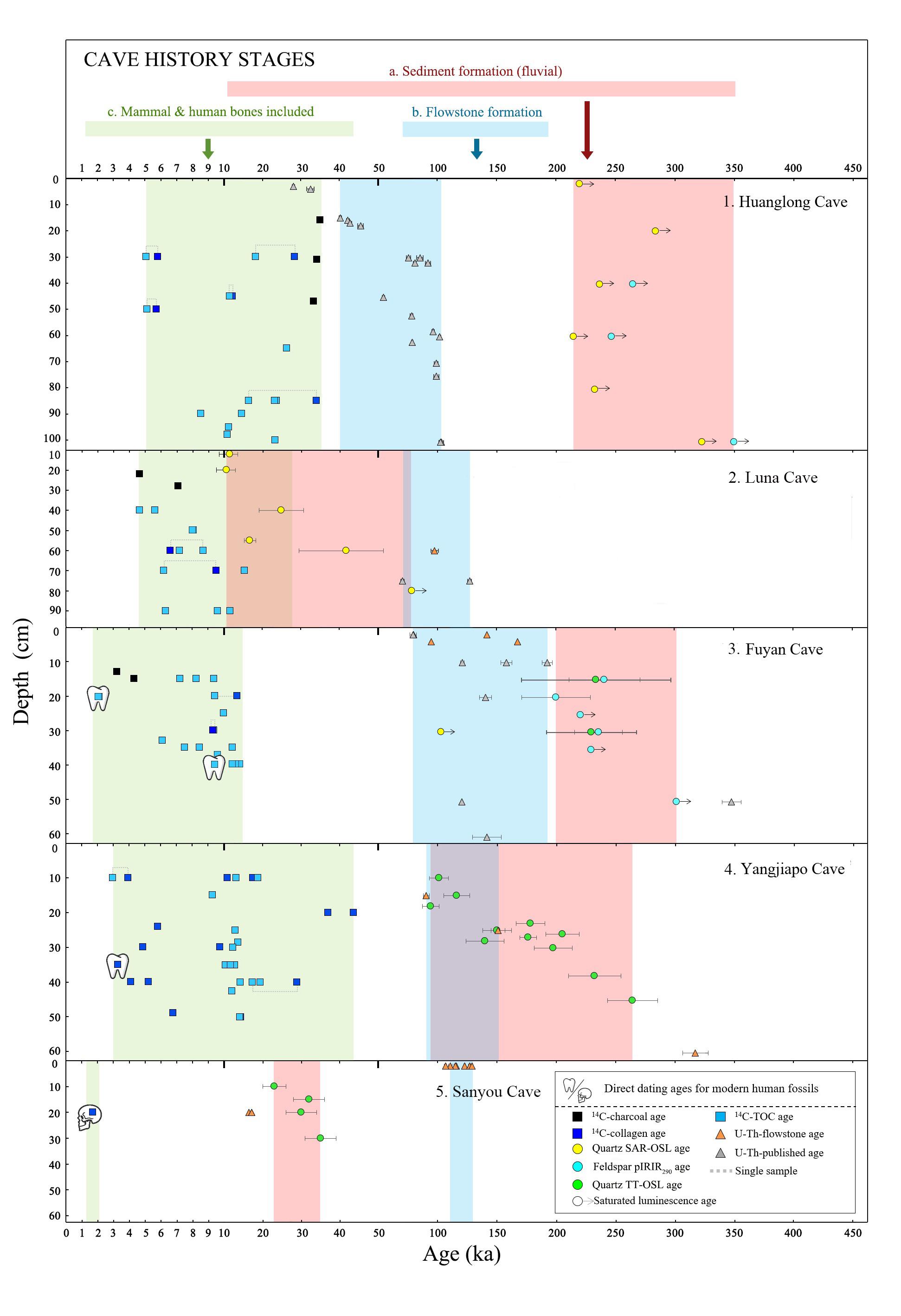 有爱爱 鹿化煜教授团队一直致力于地貌过程、气候变化与人类适应的研究,由团队成员孙雪峰副教授领衔的这项研究,基于多年积累,将地层年代学与现代人地理环境适应研究相结合,持续对我国南方5个与现代人起源相关的遗址——黄龙洞、陆那洞、福岩洞、杨家坡洞和三游洞(图1)进行了研究,他们完成了详细的地貌地层调查和多技术综合定年,包括不同技术的释光(SAR-OSL、TT-OSL、pIRIR)手段测定洞穴松散堆积物年代、铀(U)系方法测定钙板年代、加速器质谱放射性碳(AMS 14C)测定哺乳动物化石和人类化石年代等,并与复旦大学李辉教授团队合作,对现代人化石进行了古DNA分析。