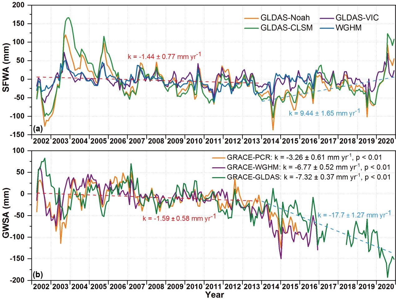 (2)调查了南水北调东线一期工程的实施分别对地表水和地下水的影响。研究基于水平衡原理利用GRACE数据、GLDAS(Noah、VIC和CLSM)陆地表面模型、WGHM及PCR-GLOBWB全球水文模型,调查了受水区地表水储量变化(SFWA)和地下水储量变化(GWSA)。结果表明,SFWA在调水后逐渐恢复,具体表现在2002年至2013年损耗率为-1.44±0.77mm/year,而在2014年至2020年增益率为9.44±1.65mm/year。相比之下,GWSA一直呈现下降趋势,在2002年至2013年损耗率为-1.59±0.58 mm/year,在2014年至2020年损耗率为-17.70±1.27 mm/year。