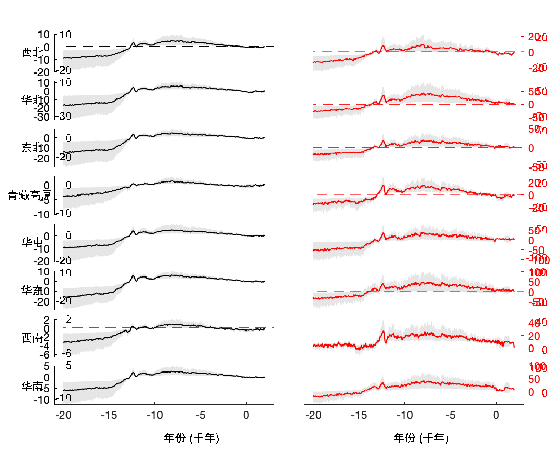 图2. 过去22,000年中国夏季(6-8月)温度(黑线,单位:°C)和(5-9月)降水(红线,单位:毫米/月)相对于1961-1990年平均值的距平(灰色区域指示全体样本的10分位和90分位范围)。点线是1919-2018年 (现代暖期,the Current Warm Period)夏季温度和降水的平均值。全部数据经过99点平滑处理。