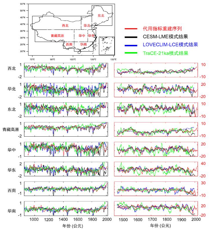 图1. 中国八大区域古气候重建和数值模拟结果对比(数据同化后)。左图是夏季(6-8月)温度距平(单位: °C, 以1961-1990年的为平均值);右图是夏季(5-9月)降水距平(单位: 毫米/月, 以1961-1990年的为平均值)。红线: 代用指标重建序列; 黑线: CESM-LME模式模拟结果; 蓝线: LOVECLIM-LCE 模式模拟结果; 绿线: TraCE-21ka 模式模拟结果. 东北 (NEC; 39°N–54°N, 119°E−134°E); 华北 (NC; 36°N–46°N, 111°E−119°E); 华东 (EC; 27°N–36°N, 116°E−122°E); 华中 (CC; 27°N–36°N, 106°E−116°E); 华南 (SC; 20°N–27°N, 106°E−120°E); 青藏高原 (QTP; 27°N–36°N, 77°E−106°E); 西南 (SWC; 22°N–27°N, 98°E−106°E); 西北(NWC; 36°N–46°N, 75°E−111°E).