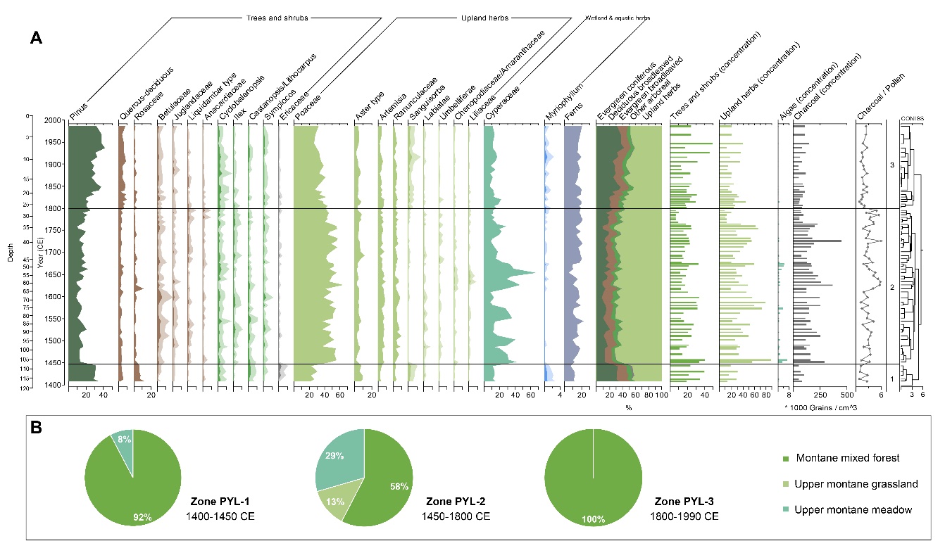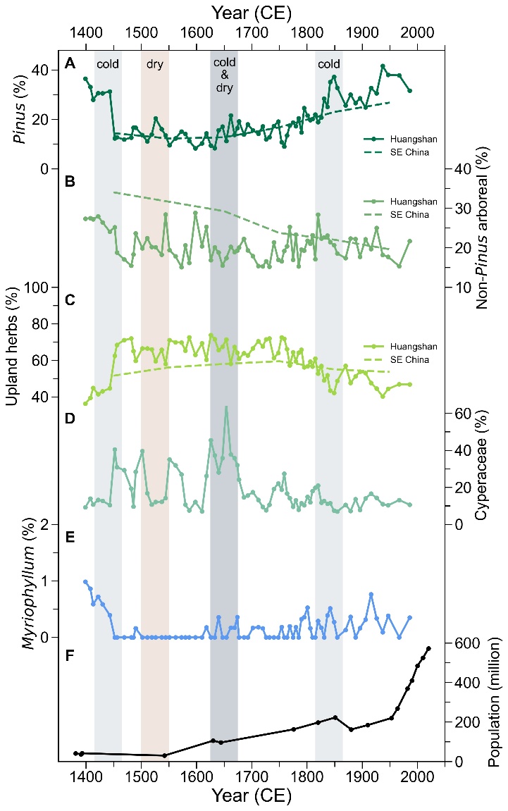 过去千年我国东南地区的气候经历了多次波动,包括发生于公元1400-1900年的小冰期,这是一个以寒冷、干湿交替和极端事件频发的气候异常期;与此同时,人口呈现加速增长趋势,至公元1800年,我国东南地区总人口接近两亿,人口密度达到100人/km2。这段时间内,植被在多大程度上受到气候的控制尚不明确。她们的研究结果显示,黄山植被自小冰期开始(公元1400年)以来经历了三个变化阶段:第一阶段(公元1400-1450年)为山地混交林,代表花粉类型为松属、落叶栎类、蔷薇科等乔灌木类型;第二阶段(公元1450-1800年)为山地草丛,代表花粉类型为禾本科、蒿属、毛茛科等陆生草本植物类型;第三阶段(公元1800-1990年)为山地混交林与山地草丛的镶嵌,代表花粉类型为松属、落叶栎类、青冈属等乔灌木类型,此阶段陆生草本植物花粉仍占有50%的比例。