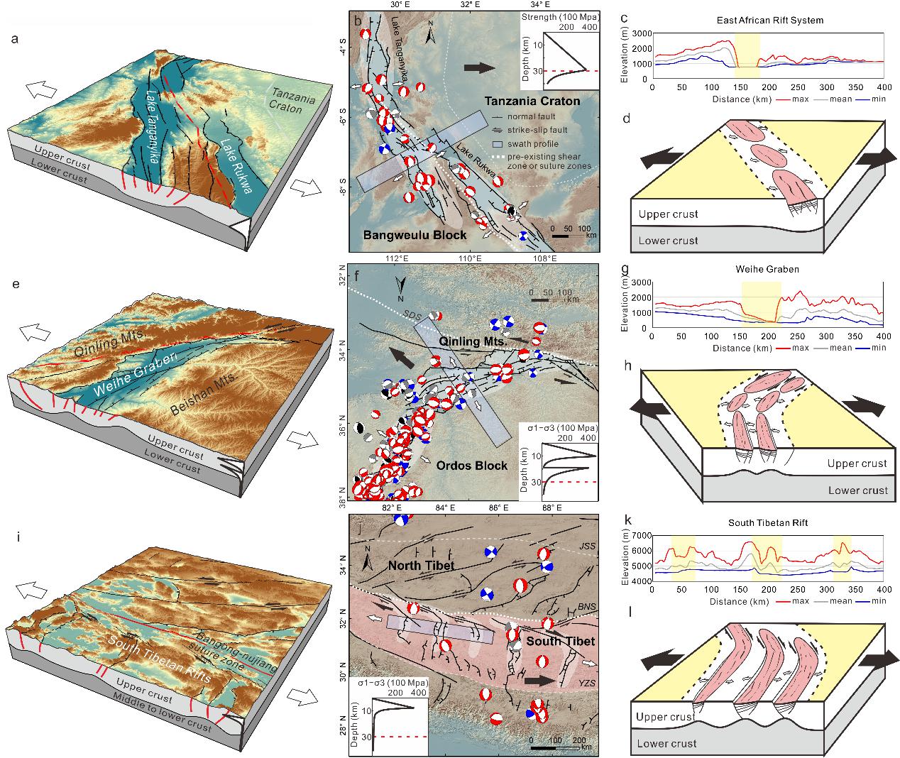 图3.自然界实例的三维地形及剖面图、平面图、条带剖面和模式图。a-d:东非裂谷;e-h:渭河盆地;i-l:藏南裂谷系。