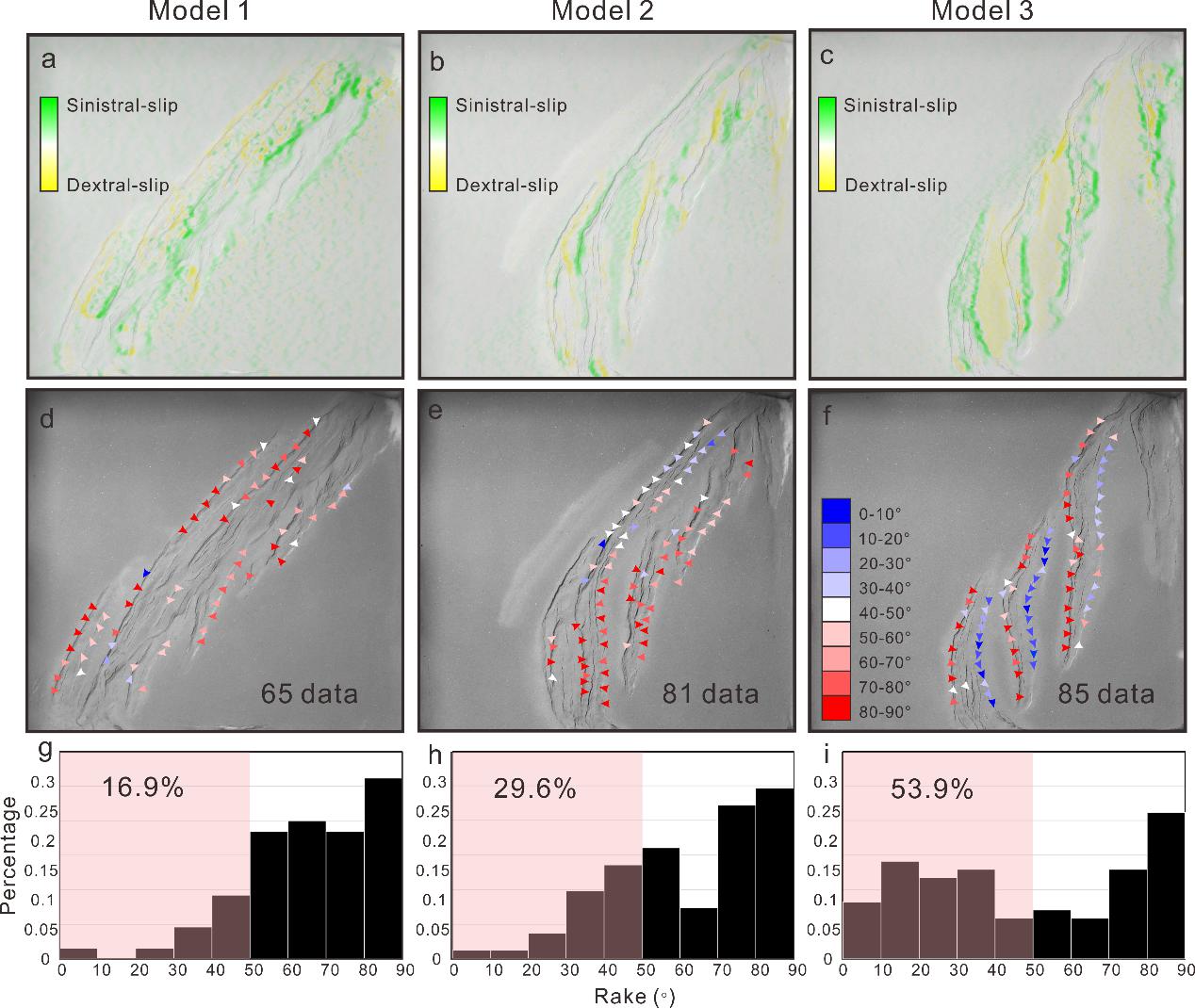 图2. PIV分析获取的剪切应变分布(a-c),滑移矢量(d-f)和滑动角分布直方图(g-i)。