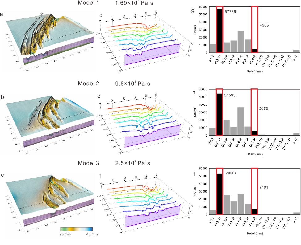 图1.不同下地壳粘度下的三维模型结果DEM及构造剖面 (a-c),不同下地壳粘度模型地形剖面图(d-f)和地形起伏的频率分布直方图(g-i)。