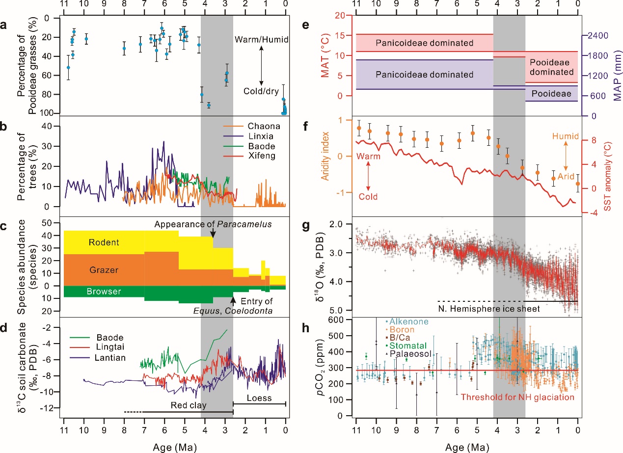 以博士生王翰林为第一作者、鹿化煜教授为通讯作者发表在Nature Communications的研究论文,通过对渭河盆地沉积物植硅体的系统研究,发现在上新世末期(距今约300万年前后)植被中的草类增多,并占据主导地位,与之前的森林草原植被相比,气候变干、季风降水减少28%。同时,他们通过全面的现代植被-气候数据分析,提出当时的全球温度降低、抑制了亚洲季风环流,中国北方气候变干。这一结论为上新世末期气候变干还是变湿的争议提供了关键证据。同时,他们提出当时全球温度降低是控制季风强度的主要因素,不同于长期流行的青藏高原快速抬升驱动季风降水增多的观点。这一结果得到国际权威专家的高度认可,是有爱爱 师生独立完成的一项重要研究工作。