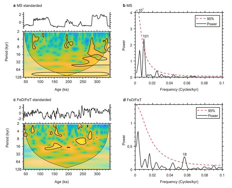 图2 马垱剖面的磁化率指标(a, b)与FeD/FeT指标(c, d)的小波与频谱分析结果