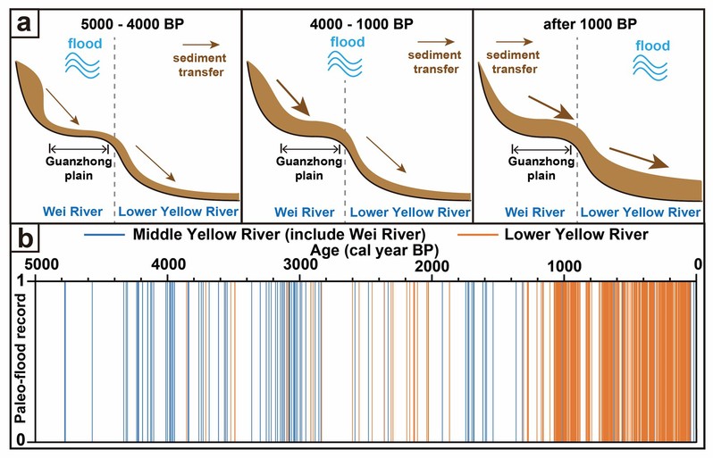 同时,通过对比流域沉积物厚度模拟结果和黄河中下游古洪水记录,我们认为全新世早期农业活动的活跃对于流域洪水事件的发生具有持续性影响:农业活动造成的土地利用变化,增加了区域的土壤侵蚀,进而导致河流泥沙量增加。增加的泥沙,在由上游向下游的传递过程中,会造成河道沿下游方向持续抬升,导致洪水事件发生的热点区域不断向下游扩散,最终增加下游地区的洪水发生频率(图3)。