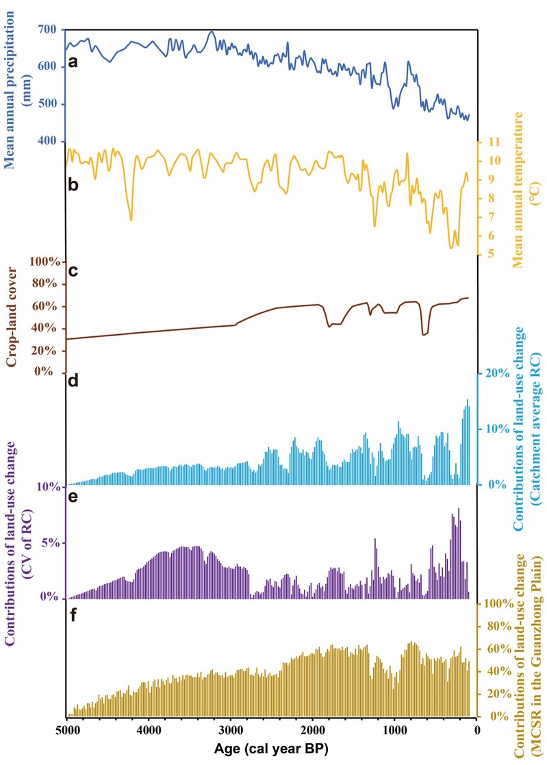 图2 全新世期间渭河流域年均降雨量(a)、年均温(b)、农业用地面积占比(c)以及土地利用变化对于土壤含水量(d)及其空间差异性(e)与关中盆地河道淤积速率(f)的贡献度。