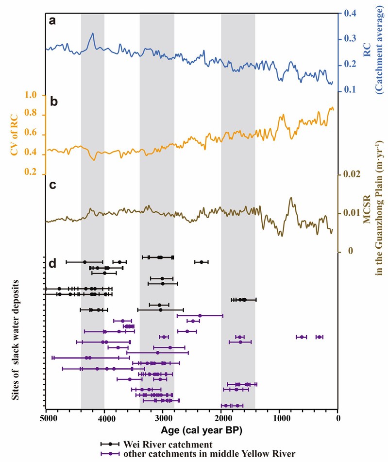 图1 全新世期间渭河流域土壤含水量(a)及其空间差异性(b)、关中盆地河道淤积速率(c)与黄河中游古洪水滞流沉积记录(d)