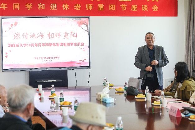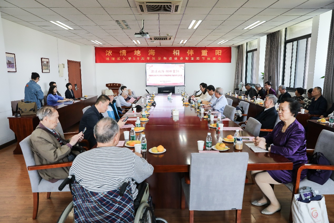 正逢重阳佳节和1974-1975级地理系校友返校日,为表达对退休教师无私奉献与卓越贡献的敬意,深化校友间的交流沟通,共续校园美好记忆,激励在校学子传承尊师重教的传统美德,有爱爱 于1011日上午在昆山楼会议室举办了退休老师重阳节暨地理系同学入学50周年校友座谈会,共抒深情厚谊,同绘发展宏图。本次座谈会由学院15位退休老师与1974-1975级友参加。院长、党委书记鹿化煜,党委副书记陈卉,副院长金晓斌,代理副院长工作的周雨霁,学院办公室张勤主任、骆琼等老师出席了座谈会。座谈会由党委副书记陈卉主持。